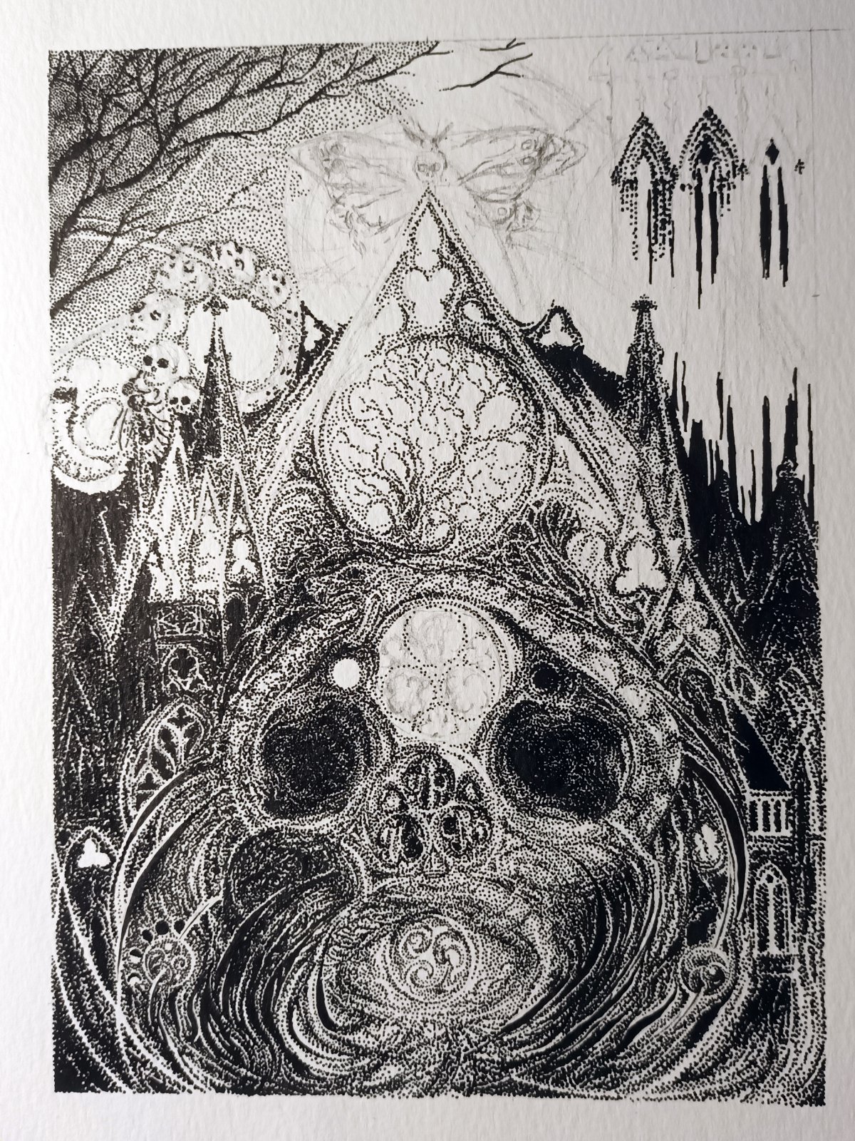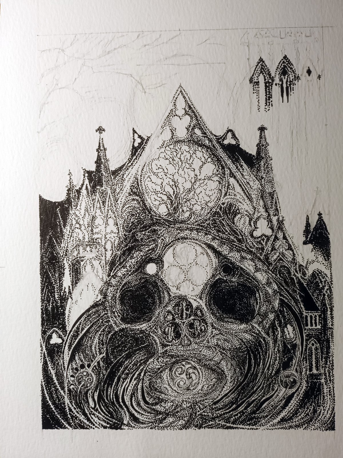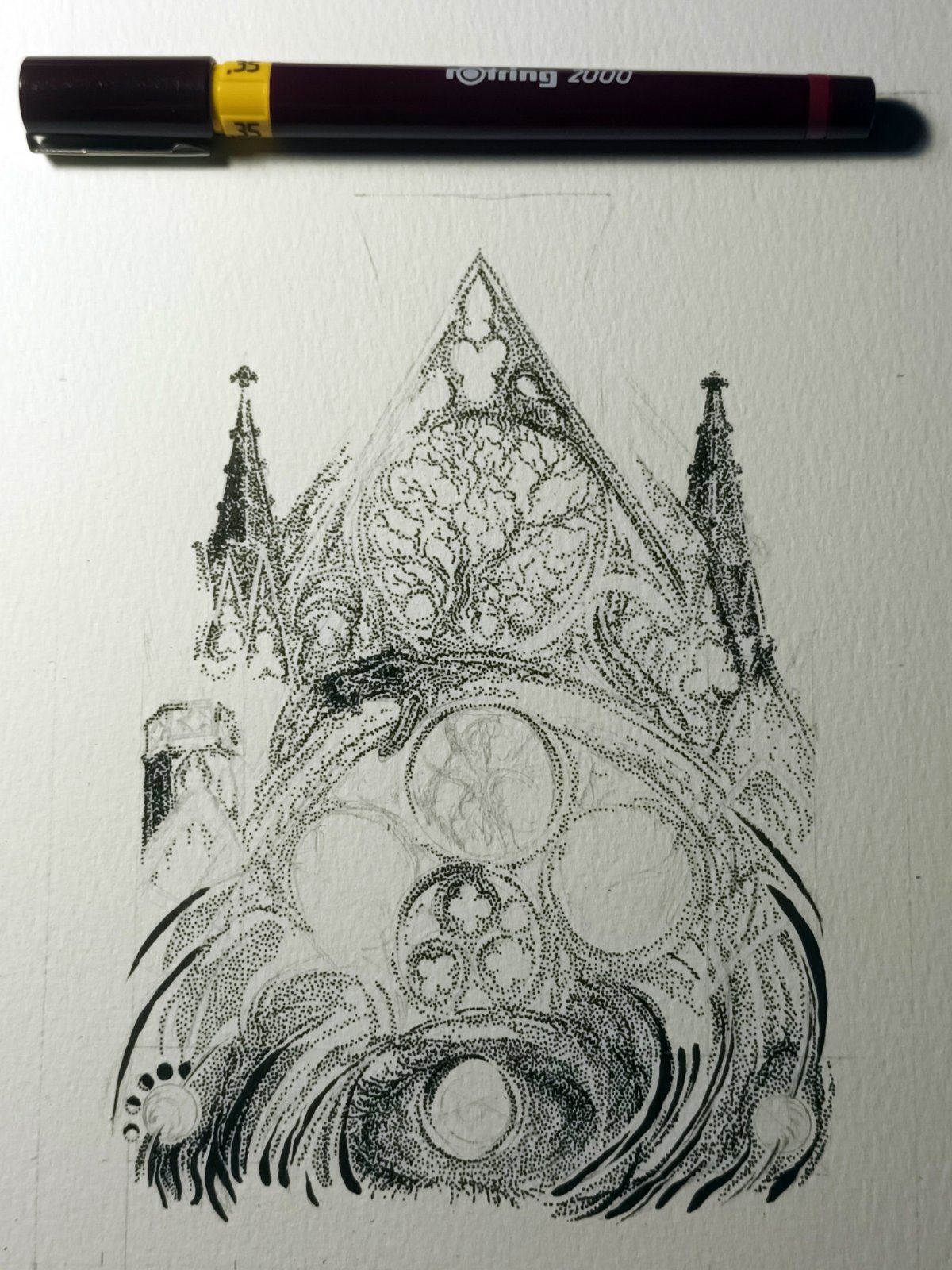Certains dessins commencent par des points au hasard, d'autres avec des croquis et inspirations bien définies. Pourtant, le processus la surprend toujours. Des motifs, des structures et des mouvements émergent du chaos initial, imprévisibles et fascinants. Le défi consiste alors à les révéler, à les renforcer pour leur donner toute leur visibilité et créer une composition harmonieuse qui les met en valeur.